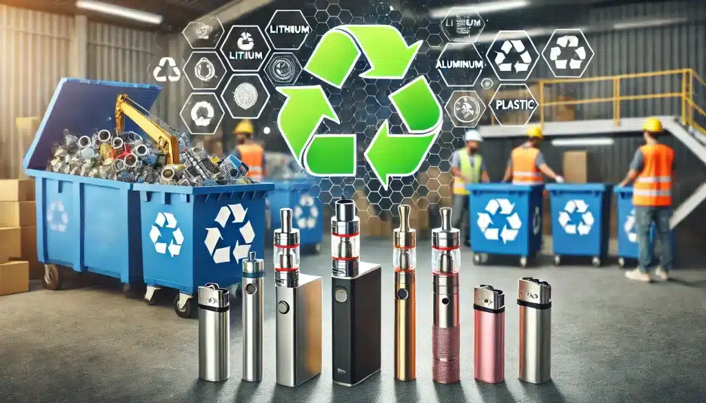 You can recycle both types of vapes. During the recycling process, they will be separated into their various components. These include the plastic or metal casing, lithium-ion battery, e-liquid tank, cotton wick, and metal coil. The cotton wick is the only component that cannot be recycled.