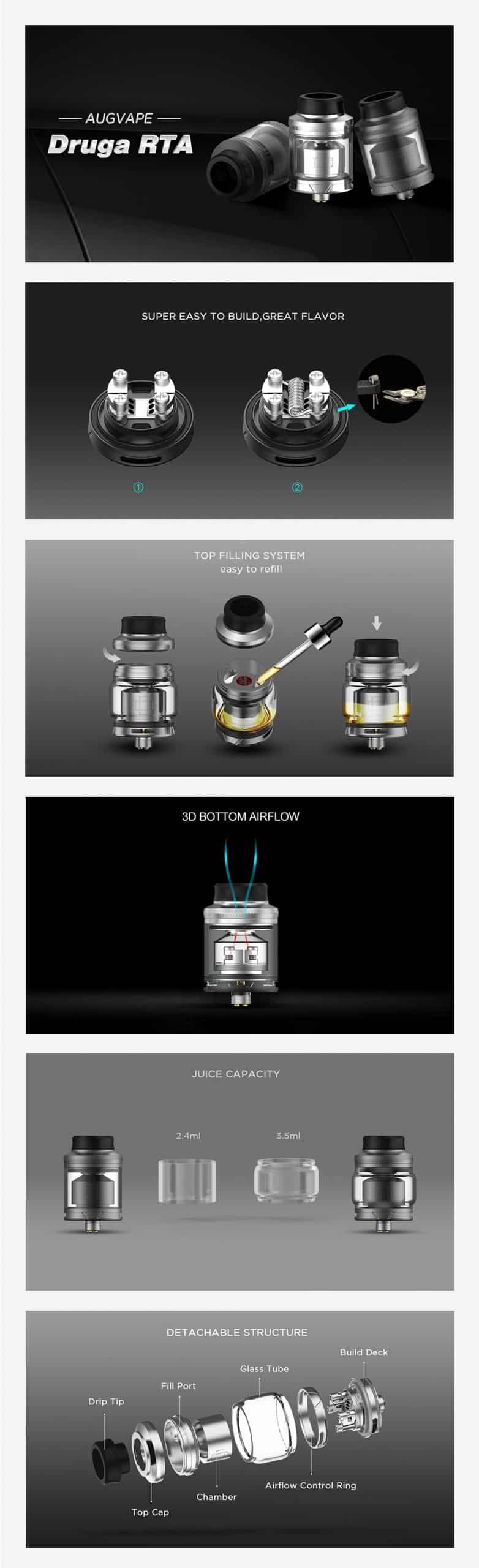 The AUGVAPE Druga RTA is here. It applies SD airflow, which allows airflow to hit the coils and travel through the chamber to the chimney. And the build deck is large enough to accommodate complex wires easily. Moreover, you can extend the Druga RTA by installing the bubble tube to a XL capacity. The 304 stainless steel construction with Pyrex glass tube make the Druga RTA so elegant and attractive.