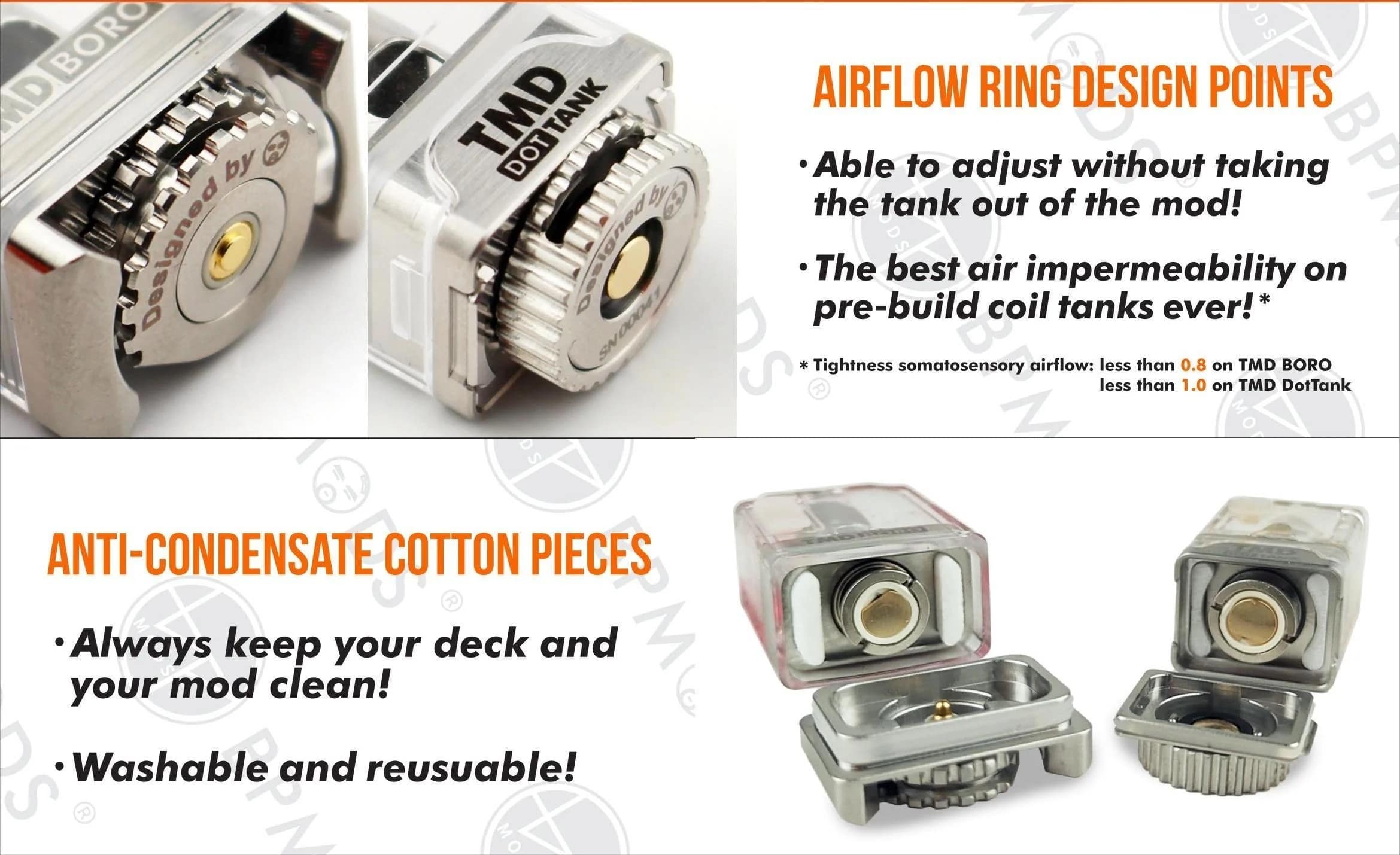 The BP MODS TMD Boro for BB Style Mods Compatible with PnP / GTX Coil / Pioneer S Tank Replacement Coils providing some excellent flexibility. Please note that it is Not fit for PnP R/M Coil and GTX Above 0.6Ω Coil. TMD BORO Tank is made of PCTG material, please avoid citrus juices which can damage the tank.