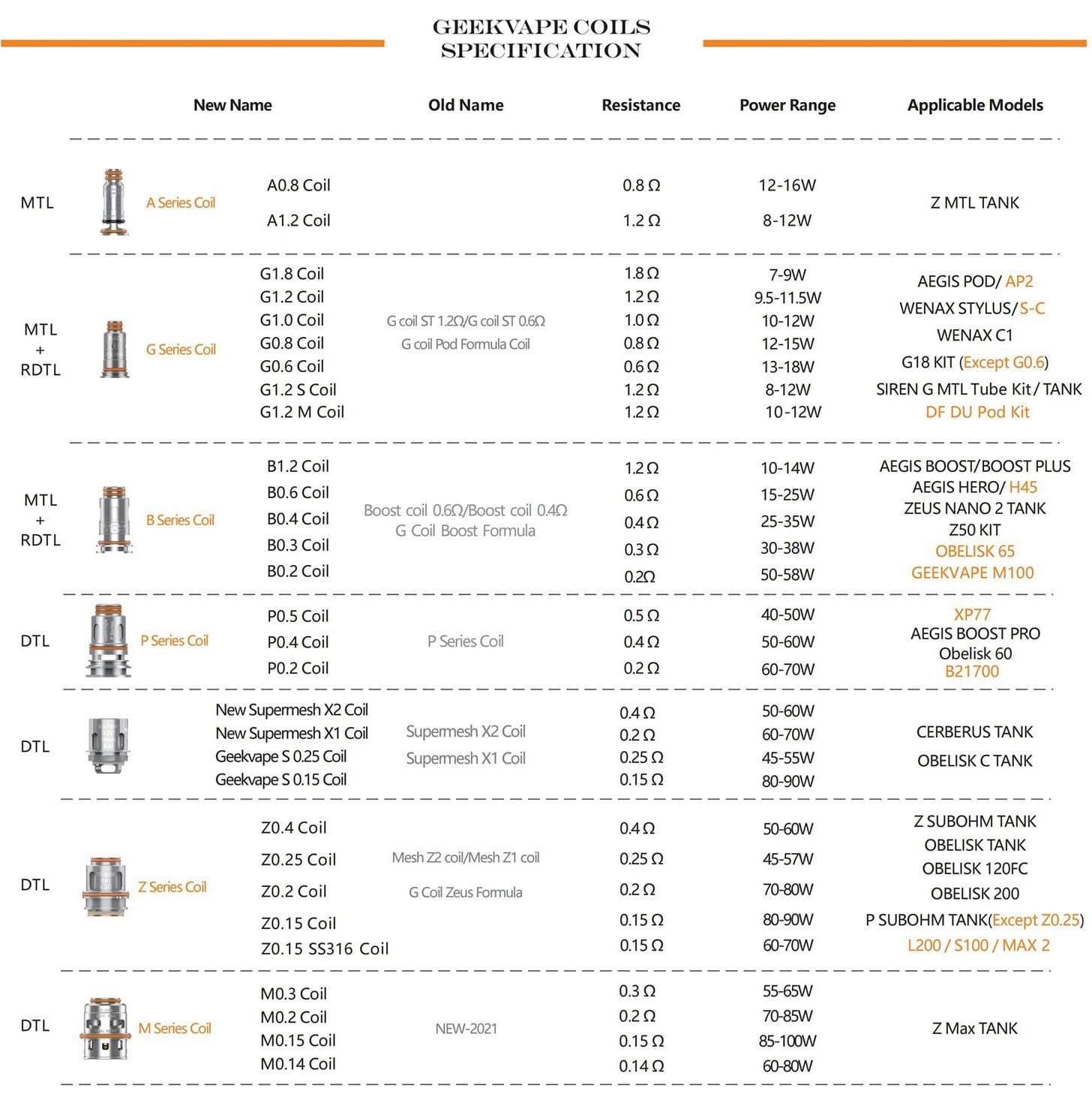 Geekvape is very well known for their attention to quality and listening to feedback from vapers. Illustrated below is a chart showing the different types of coils that are compatible with the many Geekvape products available.