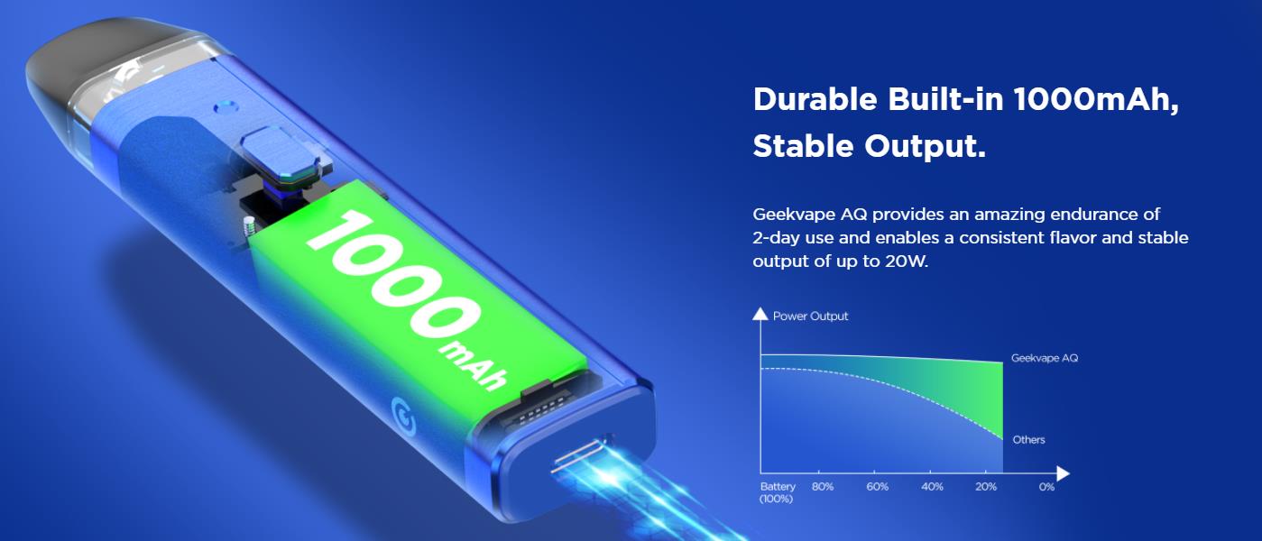 In our opinion, meet the most reliable travel companion- the Geekvape AQ (Aegis Q) Pod Kit. Featuring a 1000mAh battery, 5-20W output range, and compatible with the GeekVape Q Pods. Housed in robust aluminum alloy and a smooth leather piece, it offers a solid and comfortable grip.