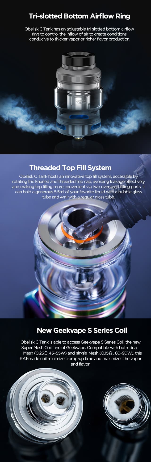 Geekvape Obelisk C Tank has arrived and a beauty this is. The incredible Cerberus Sub-ohm Tank returns to the market with some exciting features. This well-designed 25mm base diameter tank updates its adjustable bottom AFC ring from dual-slotted to tri-slotted. The Obelisk C Tank comes with a XL juice capacity with simple top fill design and 810 drip tip. Compatible with the Geekvape S Series Coil.