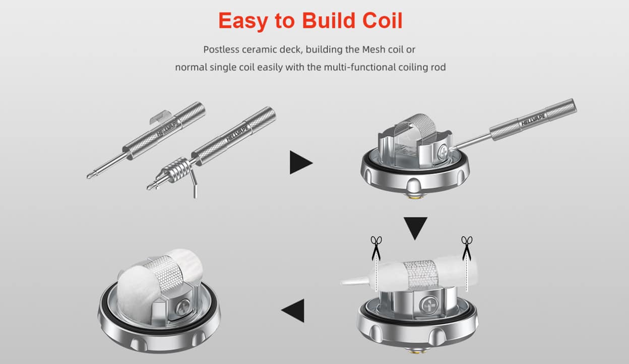 This RTA is versatile it can accommodate both the mesh wire coil and standard coils as illustrated above. There is a mesh wire option dedicated specifically for this RTA and if you are looking for standard coils then we recommend the Wotofo Pre-Made Coils or the Vandy Vape Performance Coils.