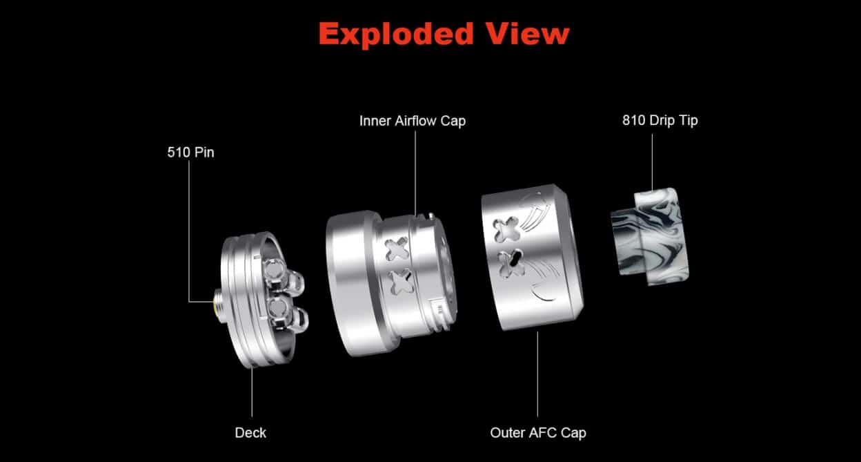 The air flow itself enters via the side of this RDA and through the X shaped cut outs. Subsequently, this travels to the sides and the tops of your chosen coils illustrated in the image below.