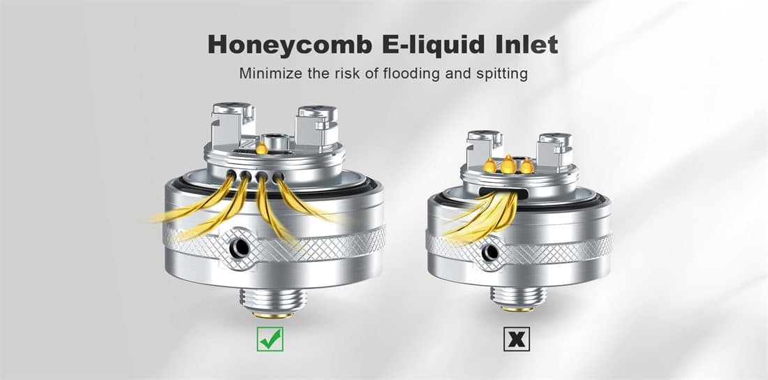 A top filling system with a single coil deck. With the addition of the independent four airflow design this RTA gives the end user choice- switching airflow is relatively easy. The honeycomb e-liquid Inlet minimises the risk of flooding and spitting which we have all experienced at one time or another. Accompanied by 2 style 510 drip tips furthermore adds to the ability to choose.