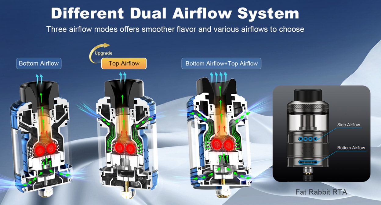 Hellvape Fat Rabbit 2 RTA comes with a nice e-liquid capacity with the pre-installed straight glass but there is a bubble glass included for free that changes the vape game. The Fat Rabbit 2 RTA has both top and bottom airflow which can be used independently or in unison to provide the best possible airflow and flavour production.