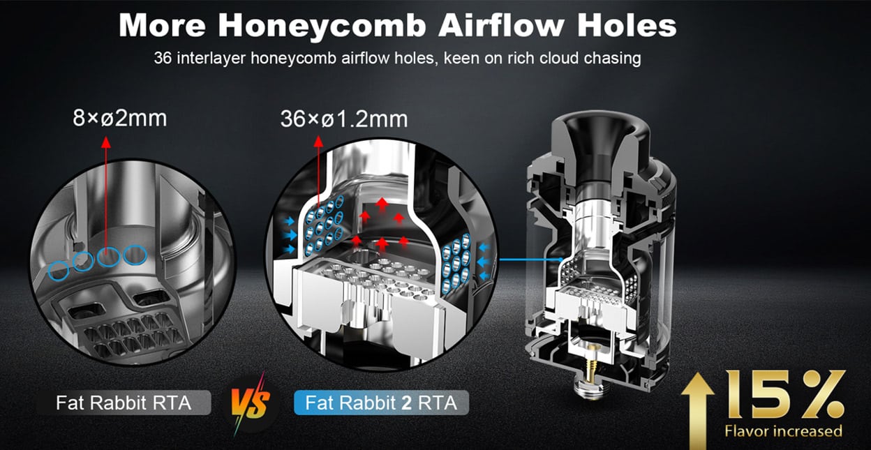It is a dual coil RTA that is has a diameter of 28mm. Thus the “Fat Rabbit” name. It makes use of honeycomb airflow to provide very good airflow.