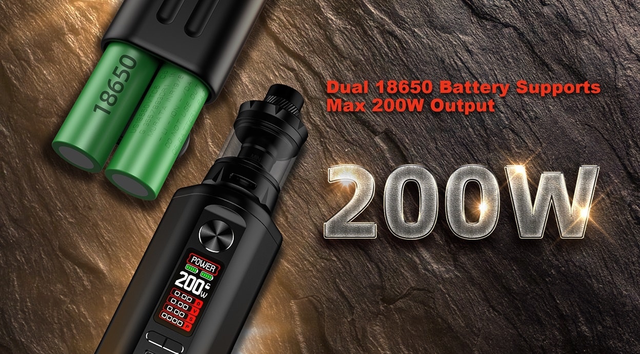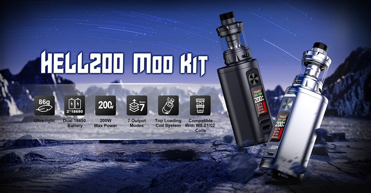 The Hellvape Hell200 Kit is ultra light, compact and portable. It is powered by dual external 18650 batteries (not included) with a 200W max output and Type-C charging. The tank itself compatible with W8-01/02 coils, top filling system and top leading coil system for leak-proof use and fast coil replacement.