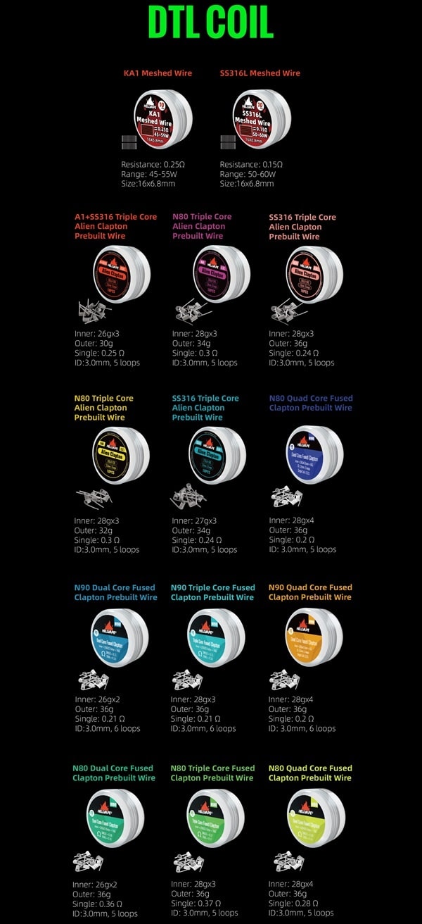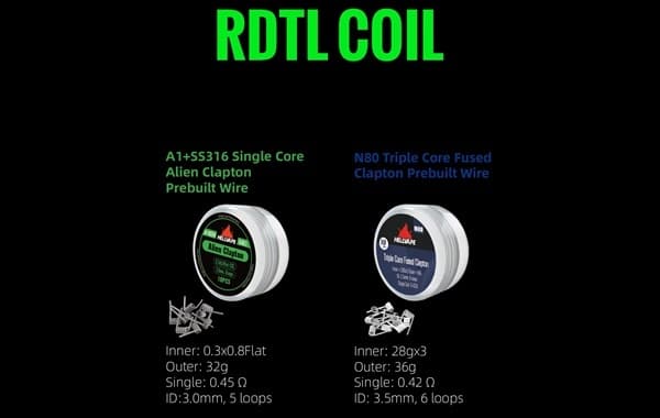 Coil Type | Alien Clapton A1 + SS316 0.25 26G x 3 + 30G, Alien Clapton A1 + SS316 0.45 0.3 x 0.8 Flat + 32G, Alien Clapton Ni80 0.30 28G x 3 + 32G, Alien Clapton Ni80 0.30 28G x 3 + 34G, Alien Clapton SS316 0.24 27G x 3 + 34G, Alien Clapton SS316 0.24 28G x 3 + 36G, Dual Core Fused Clapton, Dual Core Fused Clapton Ni90, MTL Clapton, MTL Dual Core Fused Clapton, Quad Core Fused Clapton, Quad Core Fused Clapton Ni80 ID 3.0mm – Single Coil 0.20, Quad Core Fused Clapton Ni90 ID 3.0mm – Single Coil 0.20, Triple Core Fused Clapton, Triple Core Fused Clapton Ni80 ID 3.5mm – Single Coil 0.42 |