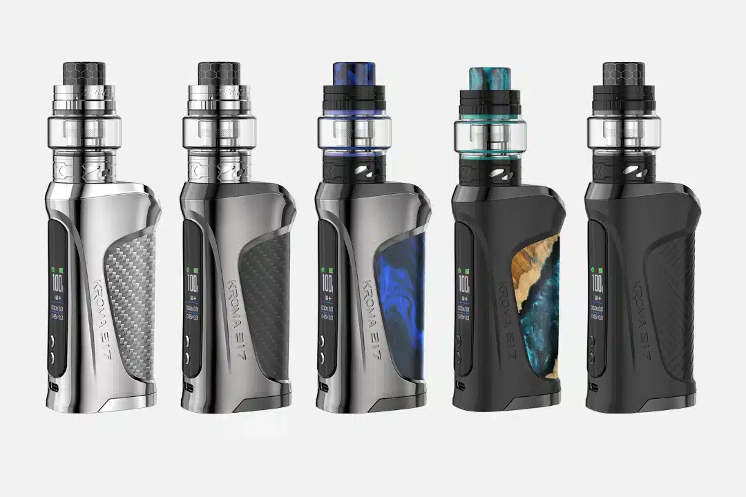 The Innokin Kroma 217 is available to purchase in five different colours. These are Carbon Fiber, Glass Fiber, Stealth Black, Mariana Blue, River Wood.