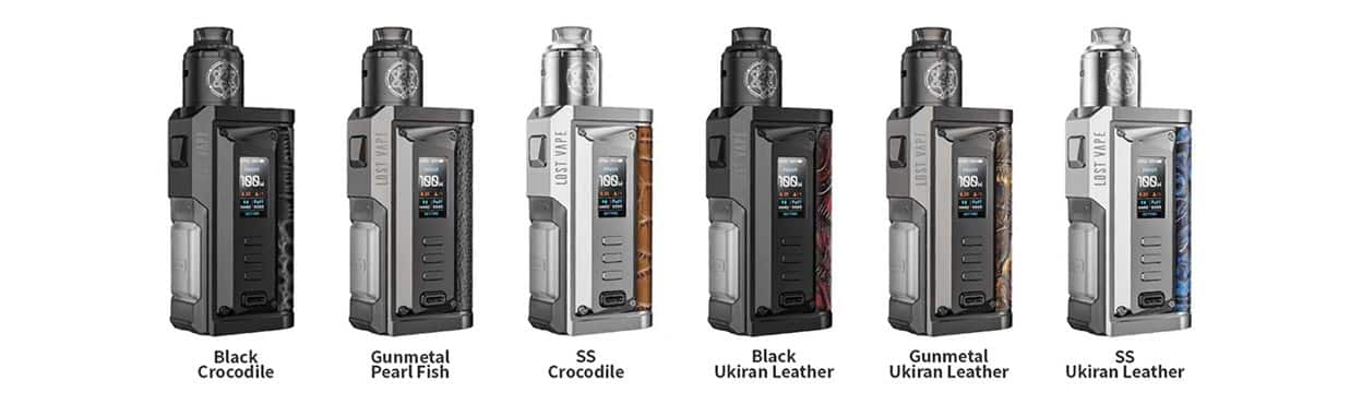 The Lost Vape Centaurus Quest BF Kit is available in six different colours: Black Crocodile, Gunmetal Pearl Fish, SS Crocodile, Black Ukiran Leather, SS Ukiran Leather and SS Ukirian Leather. Pick up your Lost Vape Squonk Centaurus Quest BF Kit today!