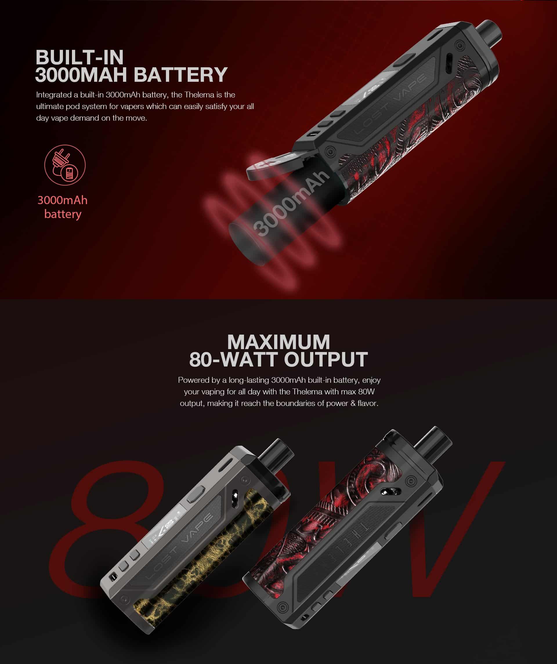 Introducing the Thelema 80W Pod Mod Kit By Lost Vape, featuring a 5-80W range, luxurious quality design elements, and an integrated 3000mAh rechargeable battery. Albeit constructed from durable zinc-alloy and quality leather, the Thelema Pod Mod Kit delivers a wonderful in hand-feel and exquisite luxurious design elements. Altogether a stunning vape pod device to add to your collection.
