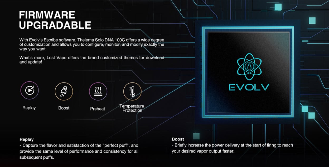 Lost Vape Thelema Solo DNA Box Mod is a 100W mod with the famous 100C DNA chip. A stunning looking mod with a powerful new DNA chip. What else does a vaper need? Maybe a little more wattage but then remember this is a single 18650 or 21700 mod.
