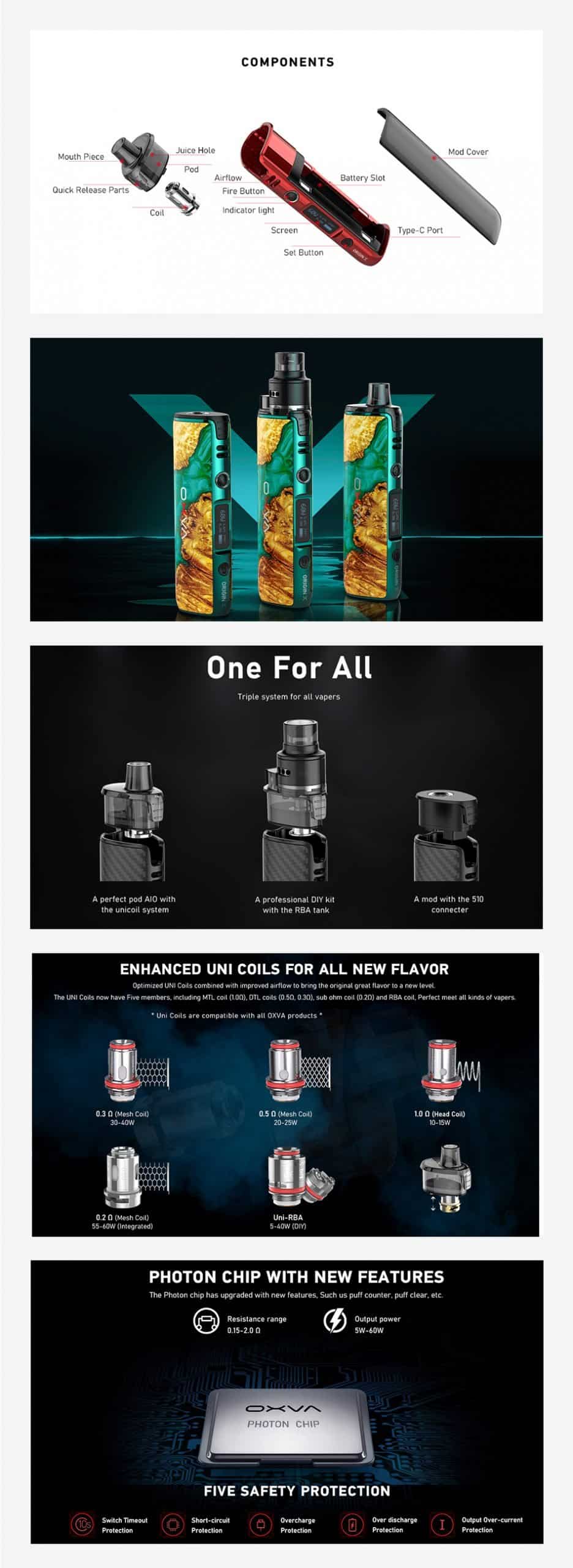 The OXVA Origin X Pod Kit is an updated version of the OXVA Origin family. Powered by a single external 18650 battery, the OXVA Origin X fires to a maximum output of 60W. The Pod Kit adopts 0,69-inch OLED screen for clear vape data display, equally important. All power adjustment can be operated on the small but sensitive button. The Origin X features a Photon chipset, bringing a stable and high performance to the vapers unlike others on the market.