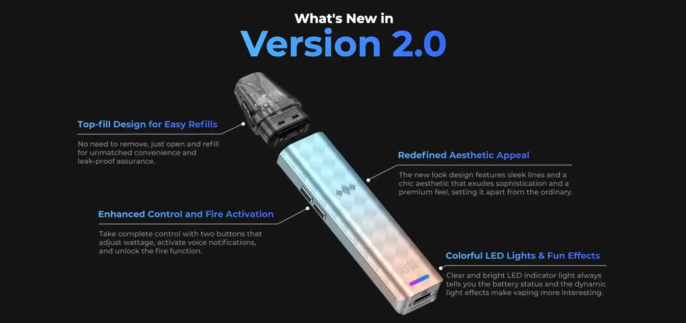 The Oxva Xlim SE 2 Pod Kit is a refillable mouth-to-lung (MTL) pod kit with a difference. Oxva’s Version 2.0 of the hugely popular Xlim SE kit features a voice broadcasting system that notifies you of your remaining battery life, pod status and applied power.