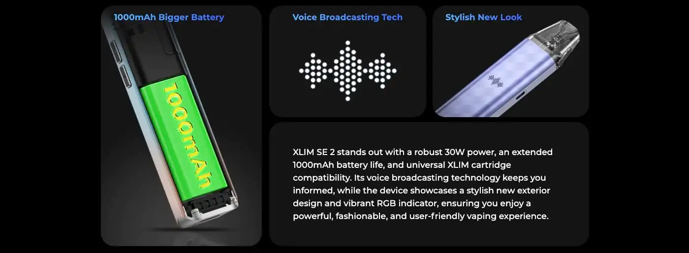 The Oxva Xlim SE 2 Pod Kit sets itself apart with its ground breaking voice broadcasting technology, providing real-time audio notifications for essential information like battery level and pod usage. This feature enhances accessibility for all users, including those with visual impairments.
