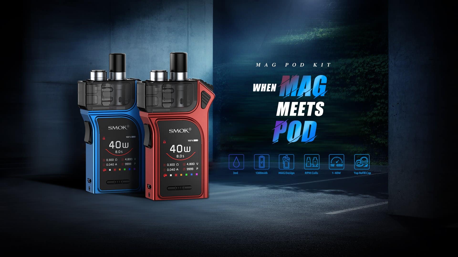 Discover the SMOK MAG POD 40W Starter Kit, capturing a 1-40W range, 1300mAh battery, and is compatibility with SMOK RPM Coil Series for exquisite vapor. Featuring a compact handheld form factor, the SMOK MAG POD 40W Starter Kit delivers a wattage range of 1-40W, working perfectly with the SMOK RPM Coil Series when installed in the XL MAG RPM Pod with threaded top fill system. In addition, the zinc-alloy chassis contains a 1300mAh battery for ample power throughout the day, reducing the need for recharges. Equipped with a colored display screen, the SMOK MAG POD can be used to great effect, fitting in a bookbag, purse, or pocket with ease.
