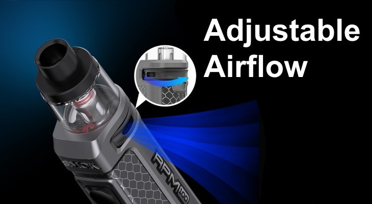The SMOK RPM 100 Pod Vape Kit is driven by a single 21700 or 18650 battery (not included). The RPM 100 Kit utilises a new feature called IML (In Mould Labeling) technique, which makes it durable and wear-resistant. The internal 0.96 inch TFT display screen makes all vape data easier to use and read for your daily vaping needs. You can adjust the airflow with the rotary air-inlet ring on the top of the device section.
