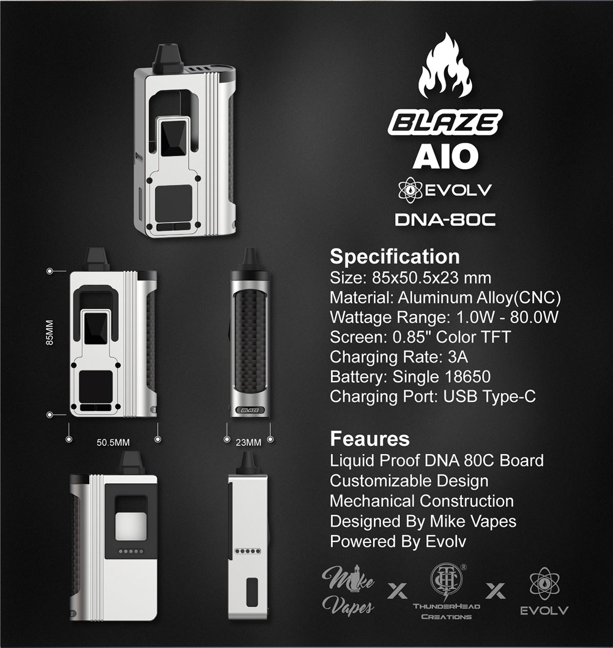 The ThunderHead Creations Blaze AIO-DNA80C represents a significant upgrade in the Blaze AIO Boro series, integrating the sophisticated DNA80C Evolv Chip. This advanced technology enables precise power adjustments and enhances your vaping experience with new modes and functionalities.