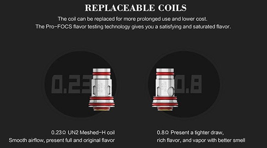 Uwell Aeglos Coil is specially designed for Uwell Aeglos Kit and has two types: 0.23ohm UN2 Mesh-H Coil & 0.8ohm Coil. These coils have built-in wire, which uses curved and perforated wire mesh. 0.23ohm UN2 Mesh-H Coil is designed for DL (direct lung) inhalation vaping, the power range of 40 to 45 watts, ensure smooth airflow and original flavour; 0.8ohm Coil is designed for MTL (Mouth-to-lung) indirect lung vaping, the power range of 20 to 23 watts, for rich flavour and better smell. And the Pro-FOCS flavour testing technology will offer you satisfying and saturated flavour. The coil can be replaced for more prolonged use and lower cost. Since the coil head is generally considered to be an easily worn item, it should be replaced regularly. This also ensures a consistent vaping experience.