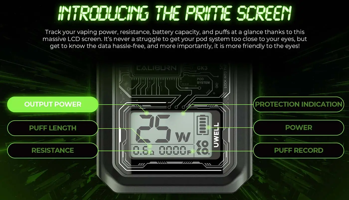 Uwell Caliburn GK3 Pod Kit has arrived utilising a novel combination of Ultrasonic Welding and a U-Shaped channel mechanism, the leakproof has been significantly improved to 150%. Leakage is now a thing of the past. Experience vaping like never before! The larger-than-ever LCD display allows you to monitor your vaping power, resistance, battery capacity, and puffs effortlessly.
