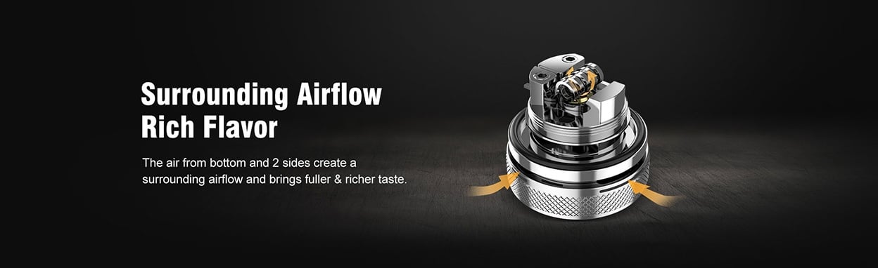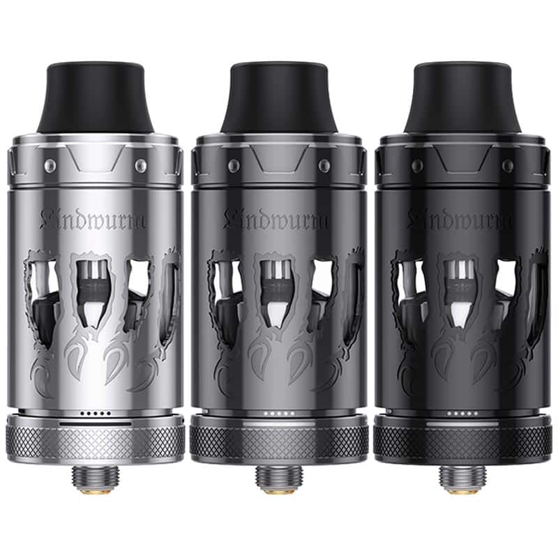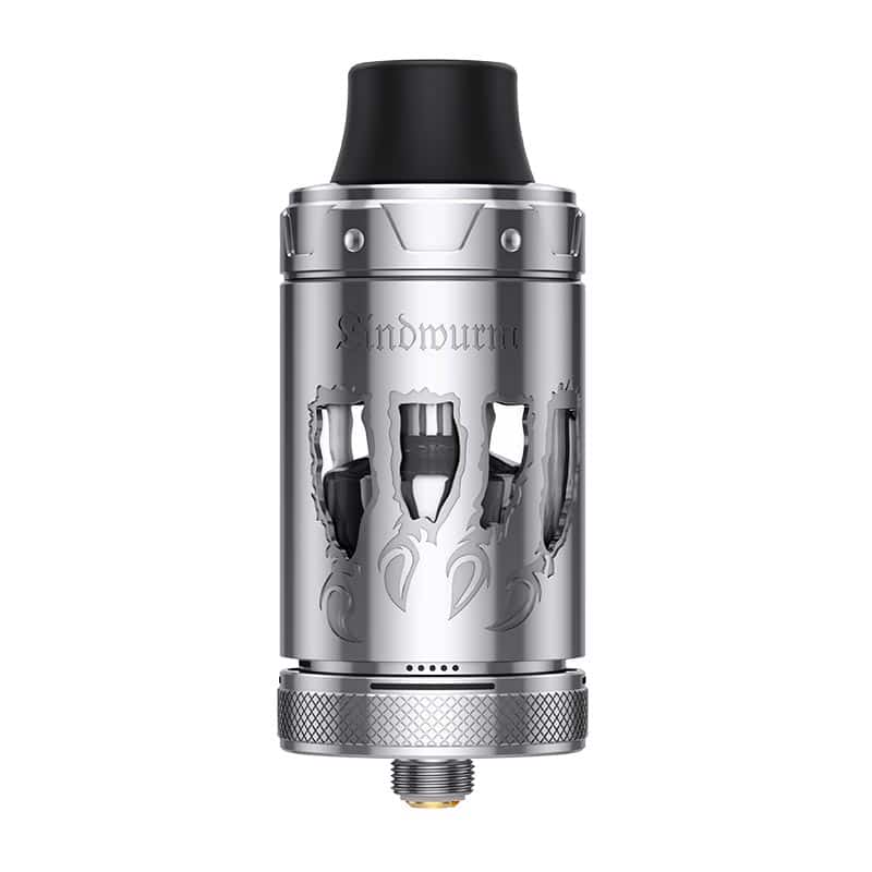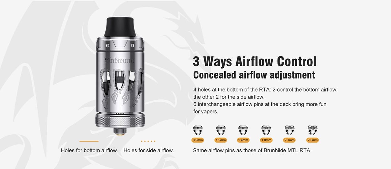 Designed with 6 interchangeable airflow pins as those of the Brunhilde MTL RTA (0.9mm, 1.2mm, 1.4mm, 1.8mm, 2.1mm, 2.5mm) it will bring about more fun for vapers. There are 4 holes at the bottom of the RTA, among which 2 holes control the bottom airflow and the other 2 holes control the side airflow. The air from bottom and 2 sides create a surrounding airflow and bring richer flavour. Flavour chasers this one is for you. The Lindwurm RTA also features single coil deck, promoting direct to lung (DL) vaping and 810 drip tip.