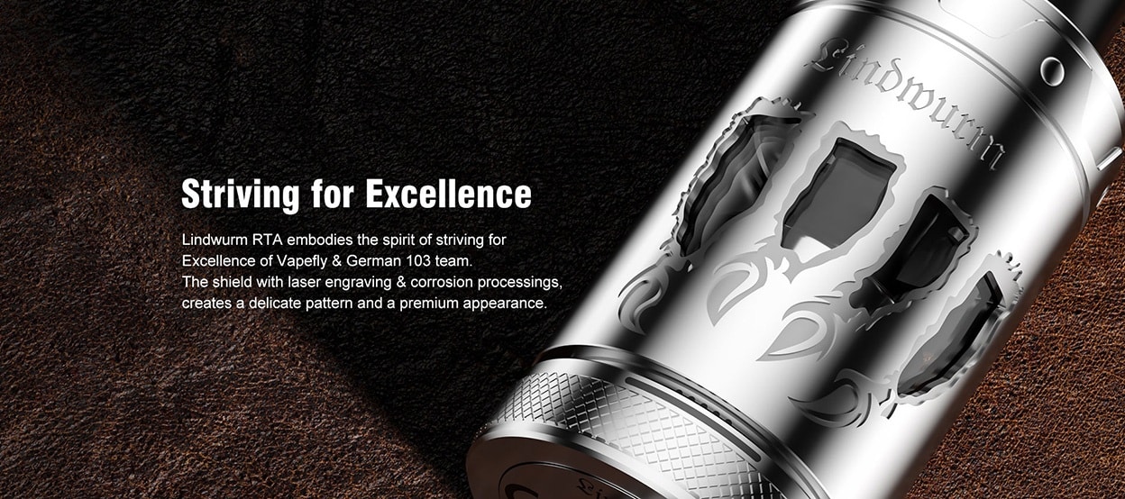 Vapefly Lindwurm RTA is added to the growing collection by Vapefly. These boffins do not do things by half and are renowned for their engineering, testing and getting things right. With a 25.5mm diameter it is designed with laser engraving and corrosion processing’s to become delicate and exquisite. This includes both oxidation and and an electrochemical process. It has a nice vape juice capacity and an easy top filling system.