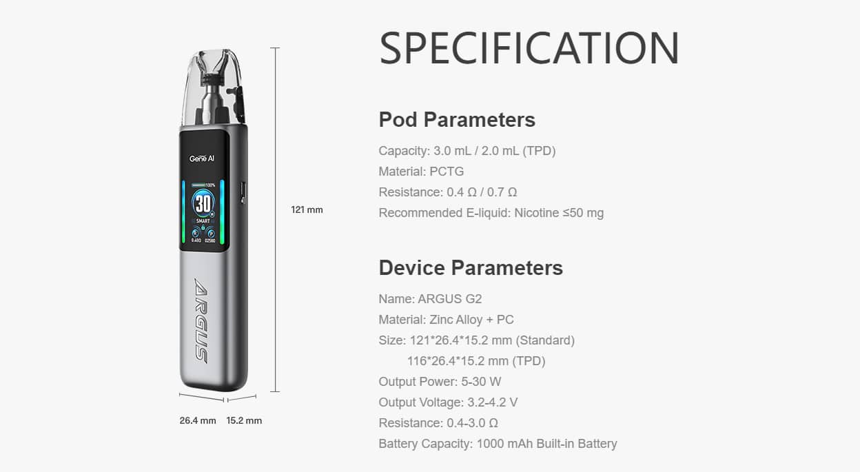 Argus G2 Kit comes with a fully upgraded new cartridge, the Argus Top Fill Cartridge that features a nice capacity, 30-day without leakage and a 90ml coil lifespan. Besides, it is also compatible with Argus Pod Family Devices (Side-fill Argus Pod 1.2ohm/0.7ohm). Designed with iCOSM CODE, VOOPOO Argus G2 will bring you a diverse vaping experience from MTL to RDL.