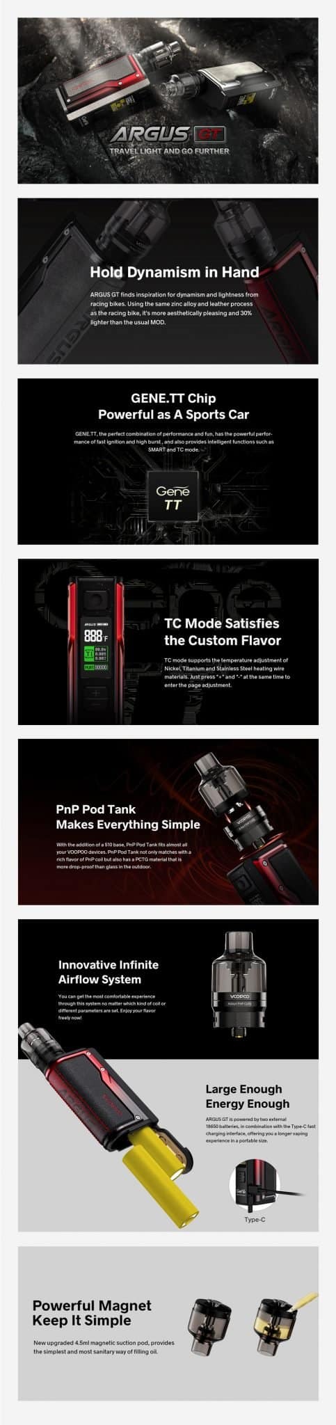 The VOOPOO Argus GT 160W TC Kit is coming! Powered by two 18650 batteries, the VOOPOO Argus GT MOD fires to a 160W max output. The VOOPOO Argus GT adopts innovative Gene.TT chipset, bringing fast firing speed with stable performance. The VOOPOO Argus GT Kit is lightweight in your palms. The Type-C charge port provides a quick and easy way for charging. The PnP Pod Tank is a new concept tank which can flexibly switch between POD and TANK. The VOOPOO PnP Pod Tank comes with 4.5ml/2ml juice capacity and double holes air intake design. The PnP Pod Tank is compatible with all PNP coil.