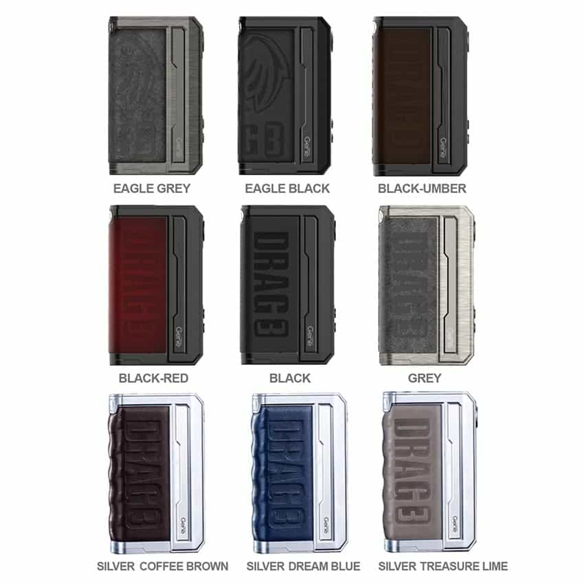 This box mod is available in a range of colours including Black, Black Red, Black Umber, Silver Coffee Brown, Silver Dream Blue, Classic, Marsala, Prussian Blue, Sandy Brown, Smoky Grey, Coffee Brown, Treasure Lime, and Dream Blue.