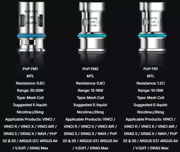 The VOOPOO Replacement PnP-TM1/TM2/TR1 Mesh Coil Heads is designed for the VOOPOO VINCI R/VINCI/DRAG S/DRAG X/ARGUS AIR Mod Pod Kits. Not forgetting the V.Suit Kit. 5 pieces each pack.