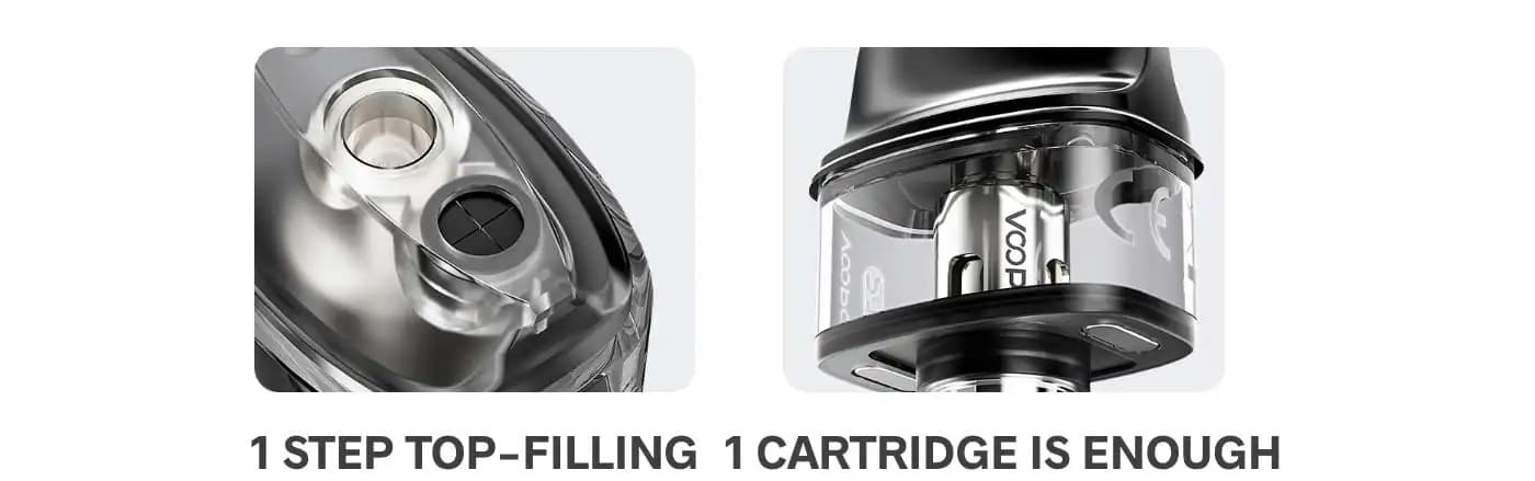 These pods/cartridges feature a very simplistic top-filling design, so you don’t have to remove it from your kit to refill it with your chosen e-liquid. The compatible 0.3 Ohm mesh coil is a good choice to improve flavour and vapour production by heating more e-liquid at a faster rate. There’s also a 0.6 Ohm coil, which will create a little less vapour. We would suggest using high VG liquids with these coil options however there is a vast range of PNP coils that you can use for nicotine salts as well.