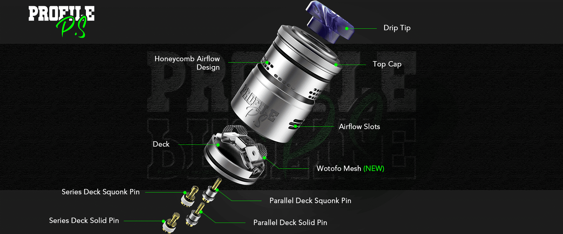 To top it all off, the Wotofo Profile PS comes in six different gorgeously elegant designs with a stunning 810 resin drip tip to match. So what are you waiting for? Get yours today and enjoy the endless benefits of this fantastic RDA!
