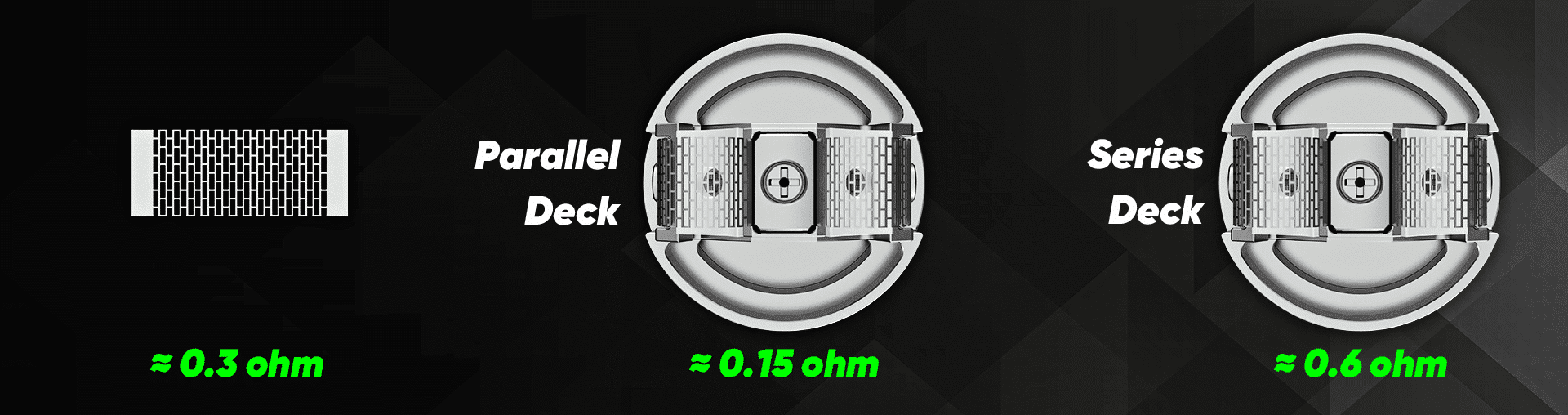 With the series deck, you are able to get 4 times the resistance with the same build on a parallel deck. This allows for a whole new range of customisation that other vapes simply cannot offer.